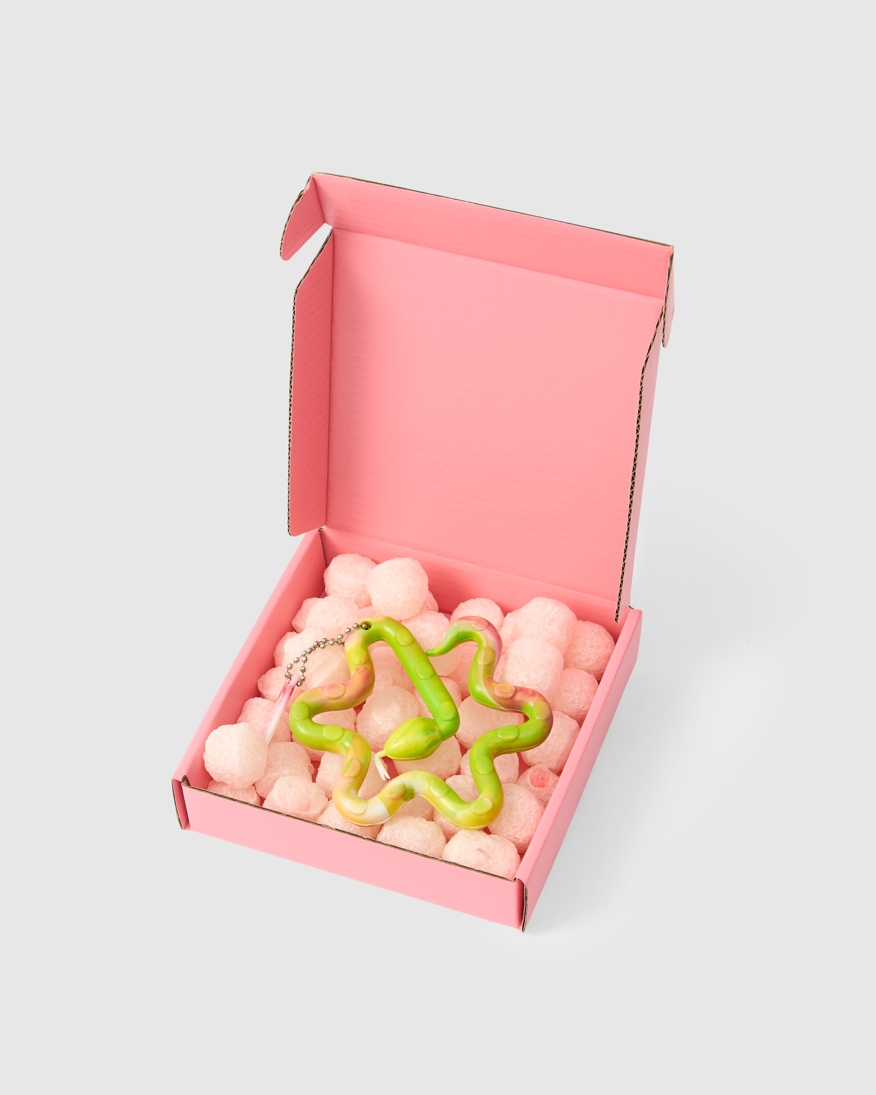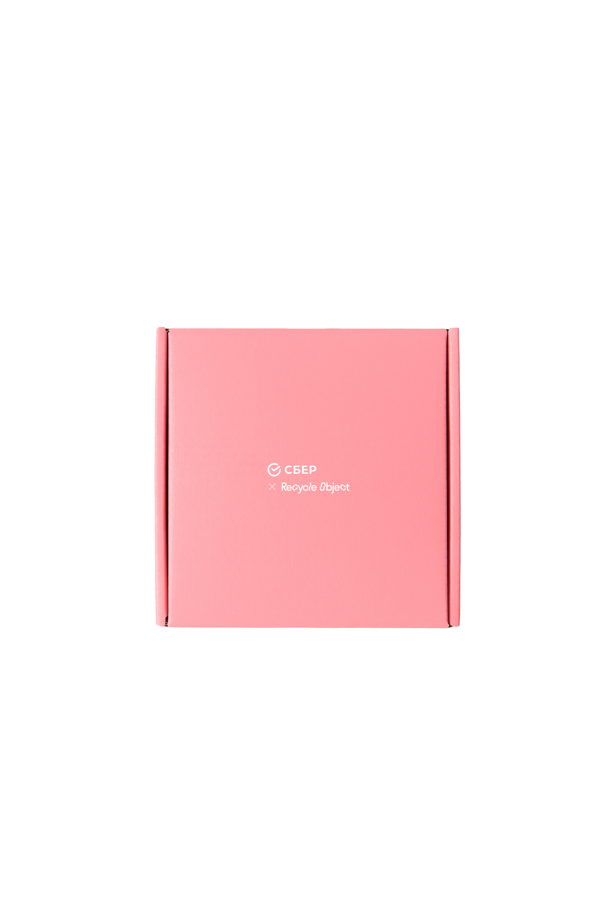 Эта экологичная коробка создана специально для украшений из переработанного пластика в рамках коллаборации СБЕР и Recycle Object. Лаконичная розовая картонная коробка с кукурузным наполнителем внутри надёжно фиксирует изделие, а брендированная наклейка в тон придаёт упаковке завершенный фирменный вид.