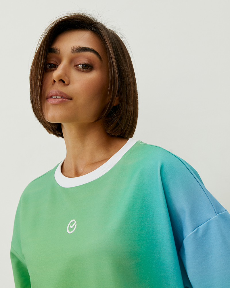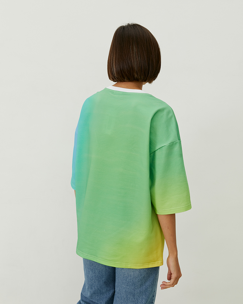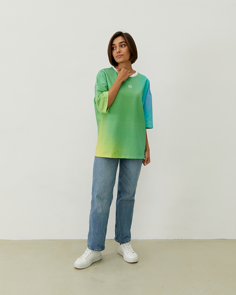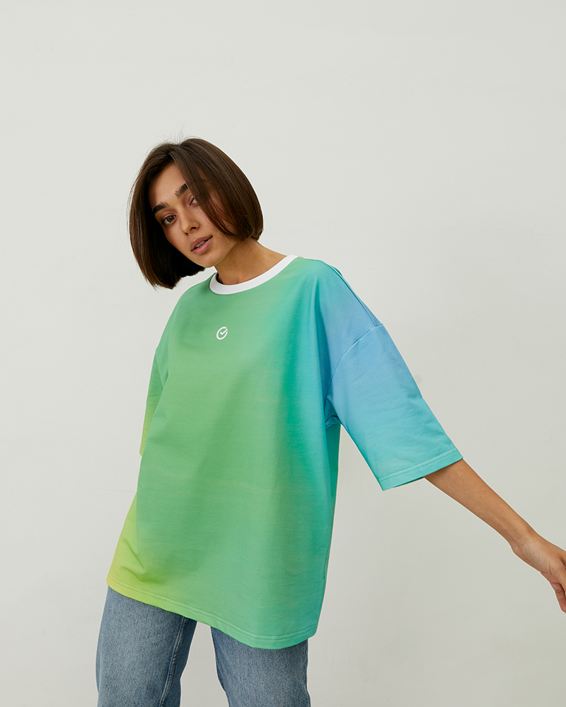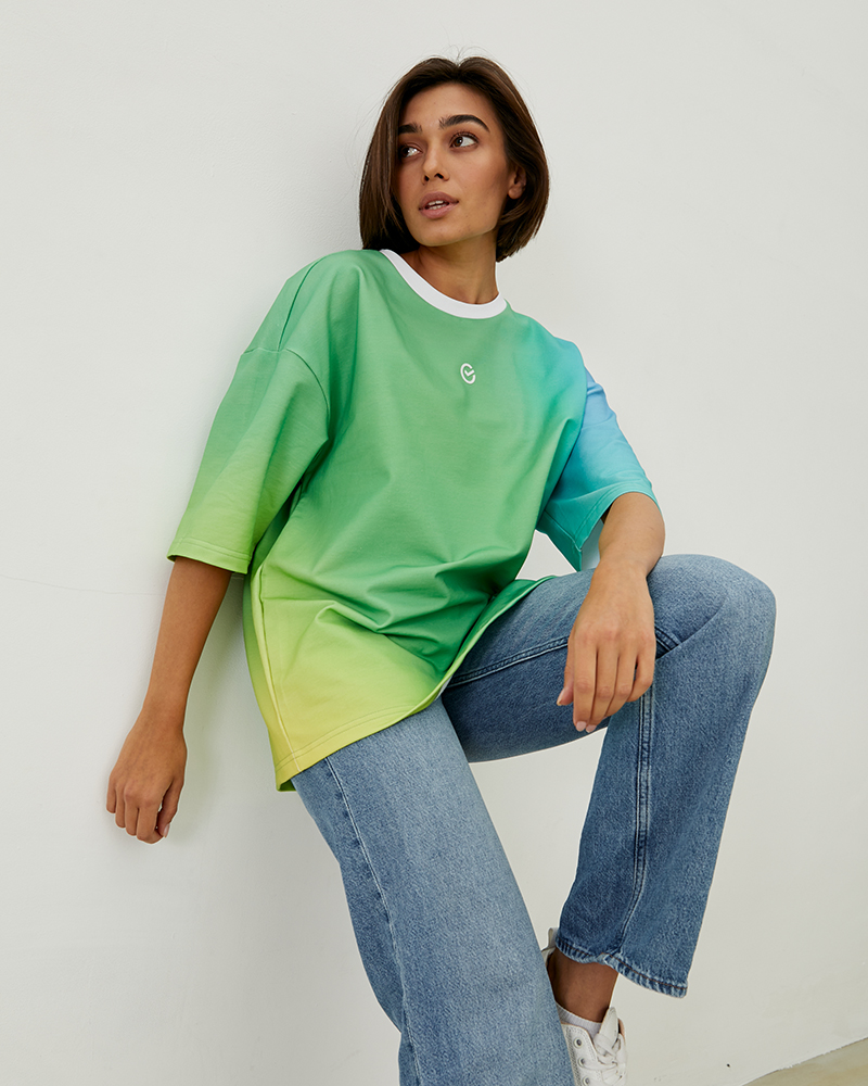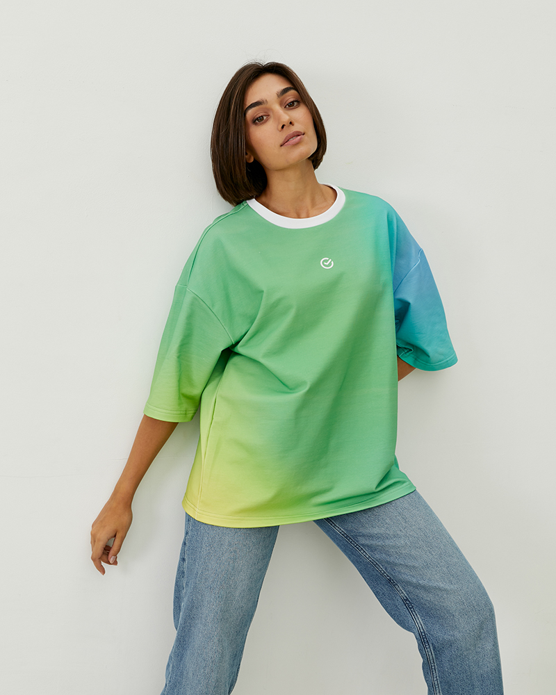 Оверсайз футболка коллекции градиент поможет разнообразить ваш гардероб яркими цветами. Хлопковая ткань с примесью лайкра обеспечивает комфортное и приятное соприкосновение с кожей. Эстетичный вид футболке придают ровные швы и контрастные белые детали, а мягкие переходы зелёного, жёлтого и голубого в дизайне создают приятное для глаза сочетание. Трендовый крой оверсайз обеспечит свободу в использовании: вы сможете собрать расслабленный образ для прогулок или активного отдыха. Футболка является унисекс-изделием — это значит, что она отлично подойдёт как для женщин, так и для мужчин.
