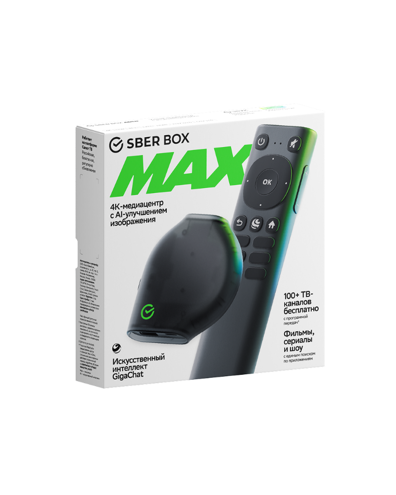 Максимум возможностей вашего телевизора раскрывается с интеллектуальным медиацентром SberBox Max. Внутри него – мощный искусственный интеллект ГигаЧат: с ним поиск и подбор фильмов становится невероятно быстрым и удобным. Популярные онлайн-кинотеатры, более 100 бесплатных телеканалов и ассистент, с которым так здорово поговорить не только о кино.
