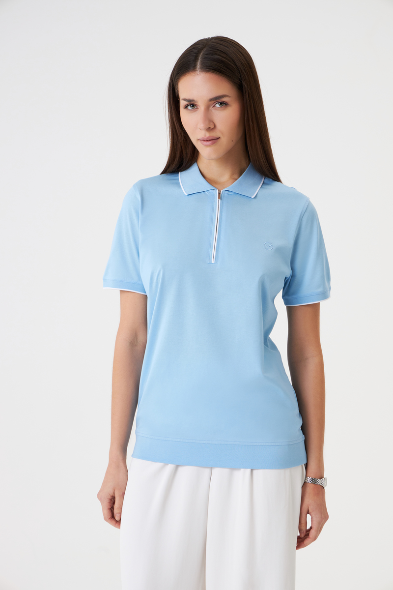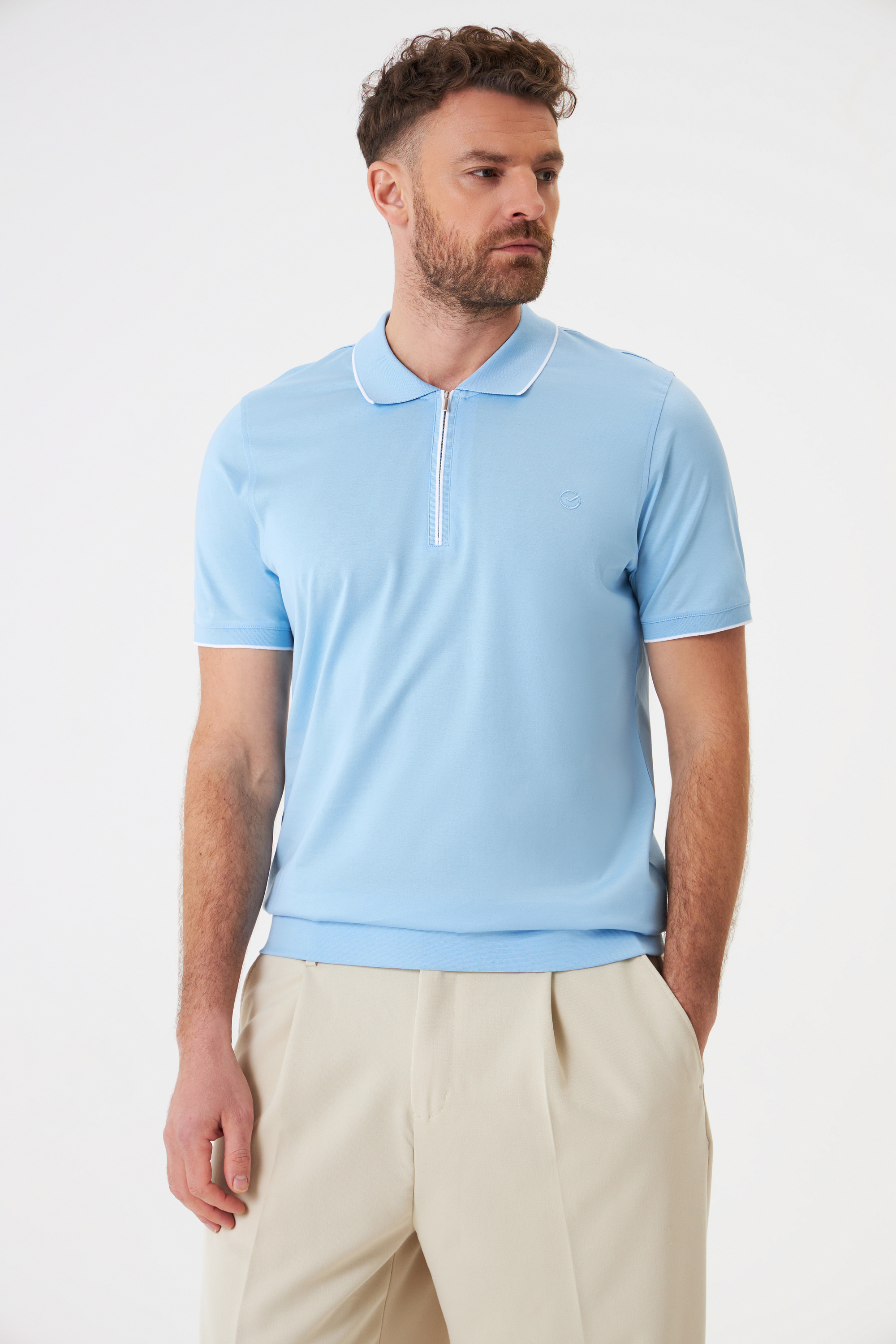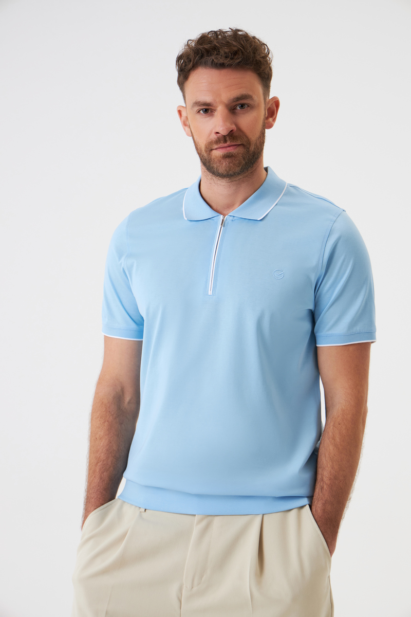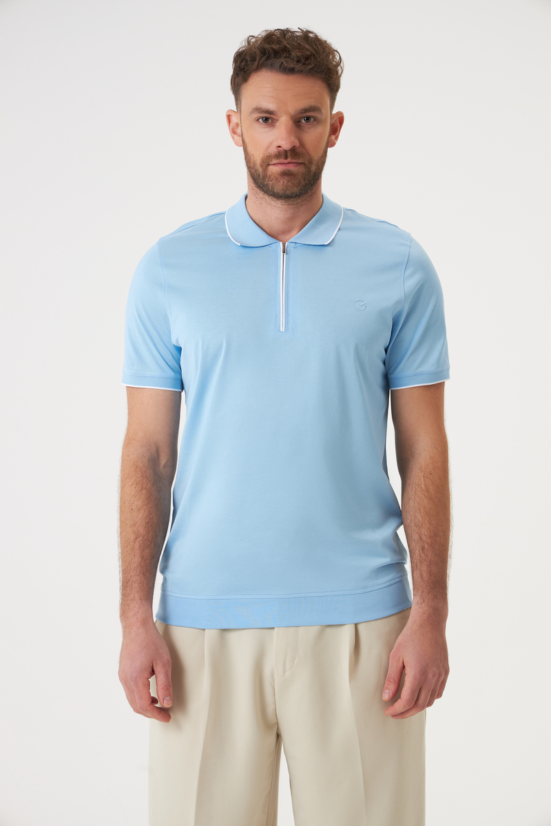 Подчеркните свой статус с жаккардовой футболкой-поло на молнии СБЕР в нежно-голубом цвете. Этот эксклюзивный предмет гардероба изготовлен из 100% хлопка SUPIMA высшего качества, произведенного из итальянских нитей с двойным плетением. Эта ткань славится своей мягкостью, прочностью и безупречным внешним видом. Деликатная вышивка 20 мм - элегантное завершение образа.