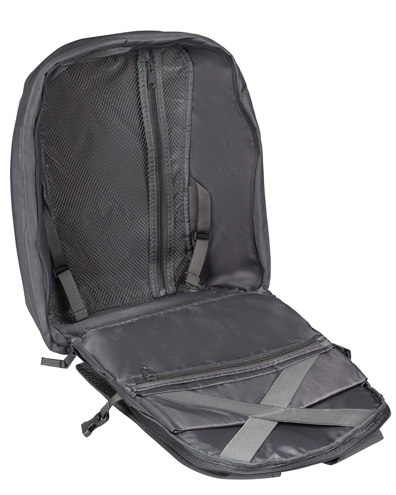 Внутри: на одной стороне один глубокий карман по всю длину рюкзака и второе отделение чуть поменьше с двумя карманами, они поддерживаются эластичными креплениямикрест на крест.Ниже еще одно отделение на молнии. На обратной стороне по всему объёму идет карман из сетки на молнии. Есть ремни для фиксации
