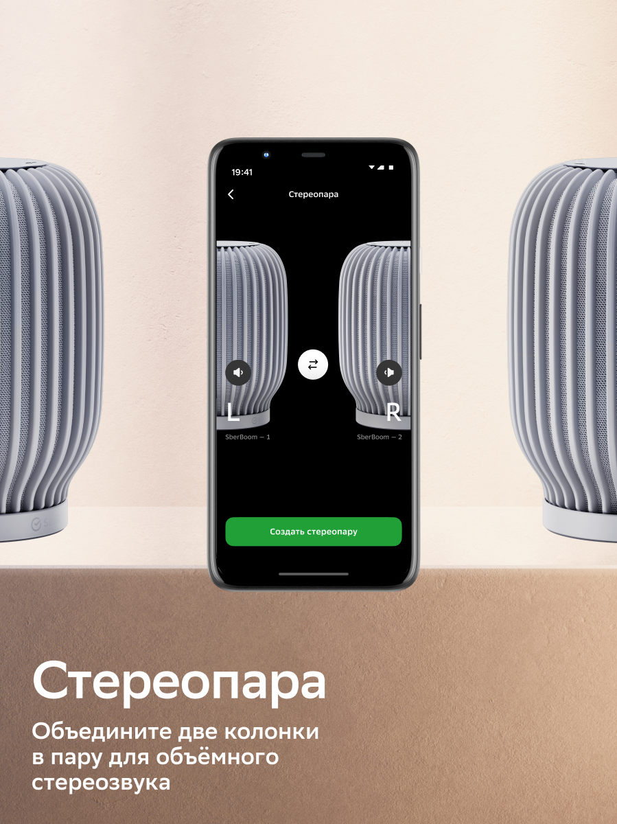 Объедините две колонки SberBoom в стереопару, чтобы создать потрясающий эффект стереозвучания. Или слушайте музыку одновременно на всех устройствах Sber c динамиками — для этого включите функцию «Мультирум».