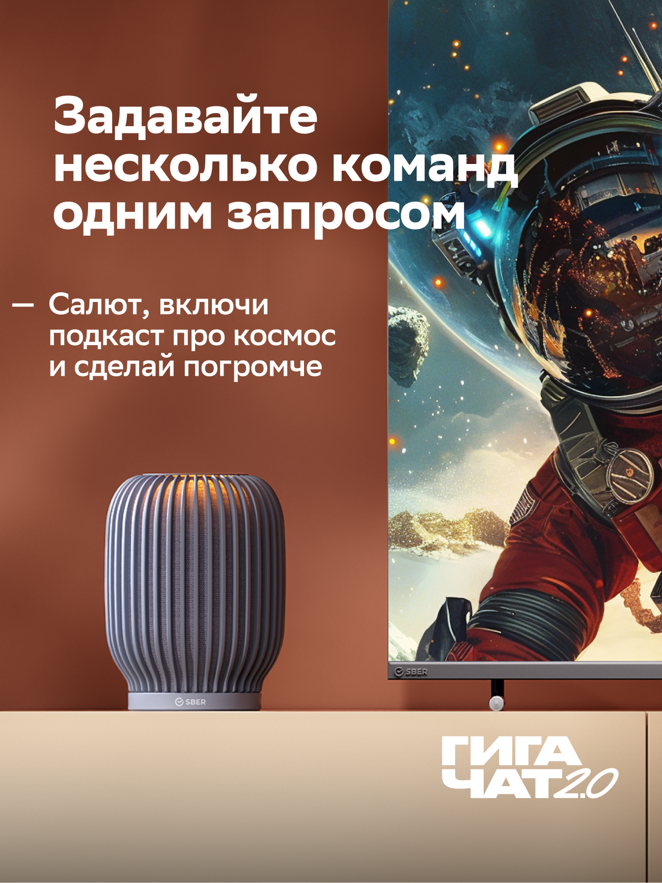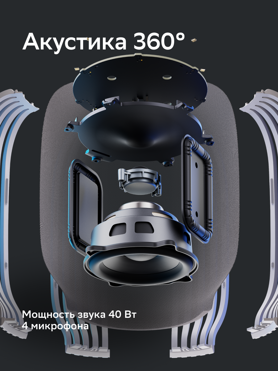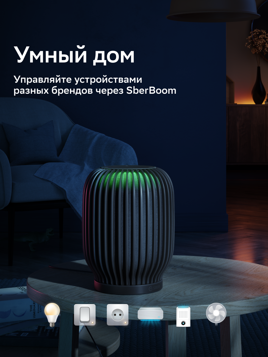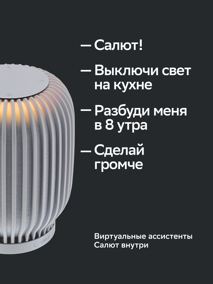 Внутри SberBoom — виртуальные ассистенты Салют. Попросите, и они найдут песню, расскажут о погоде, будут управлять устройствами умного дома или помогут занять детей.
