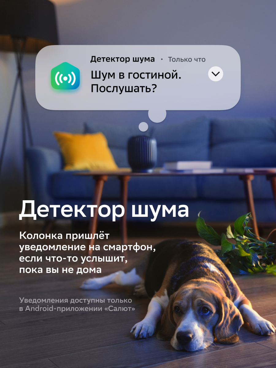 А чтобы не беспокоиться о безопасности, активируйте «Детектор шума». SberBoom будет анализировать звуки вокруг, пока вас нет дома. Если колонка услышит лай собаки, звон стекла или другой подозрительный шум, на ваш Android-смартфон придёт уведомление с аудиозаписью. Вы сможете её прослушать и принять меры.