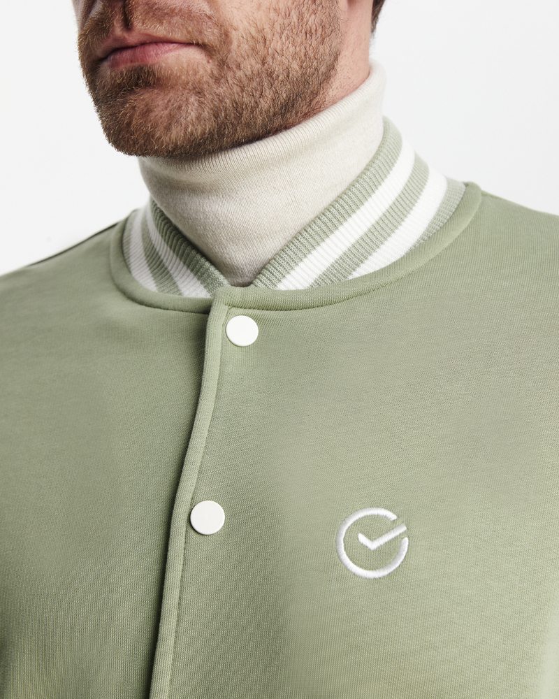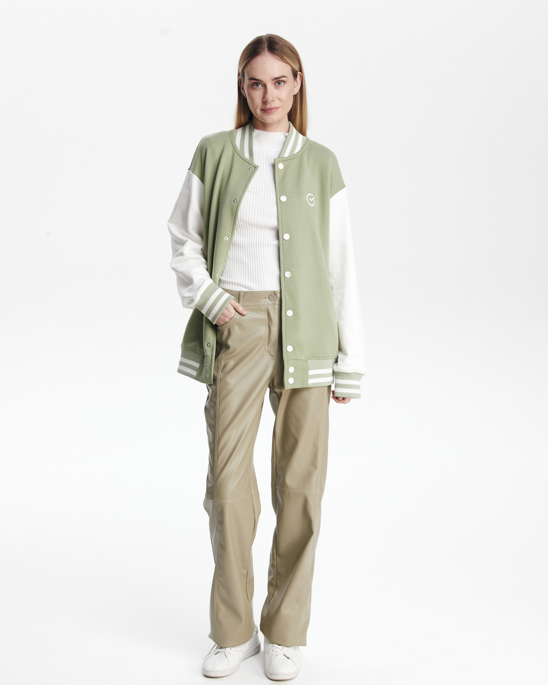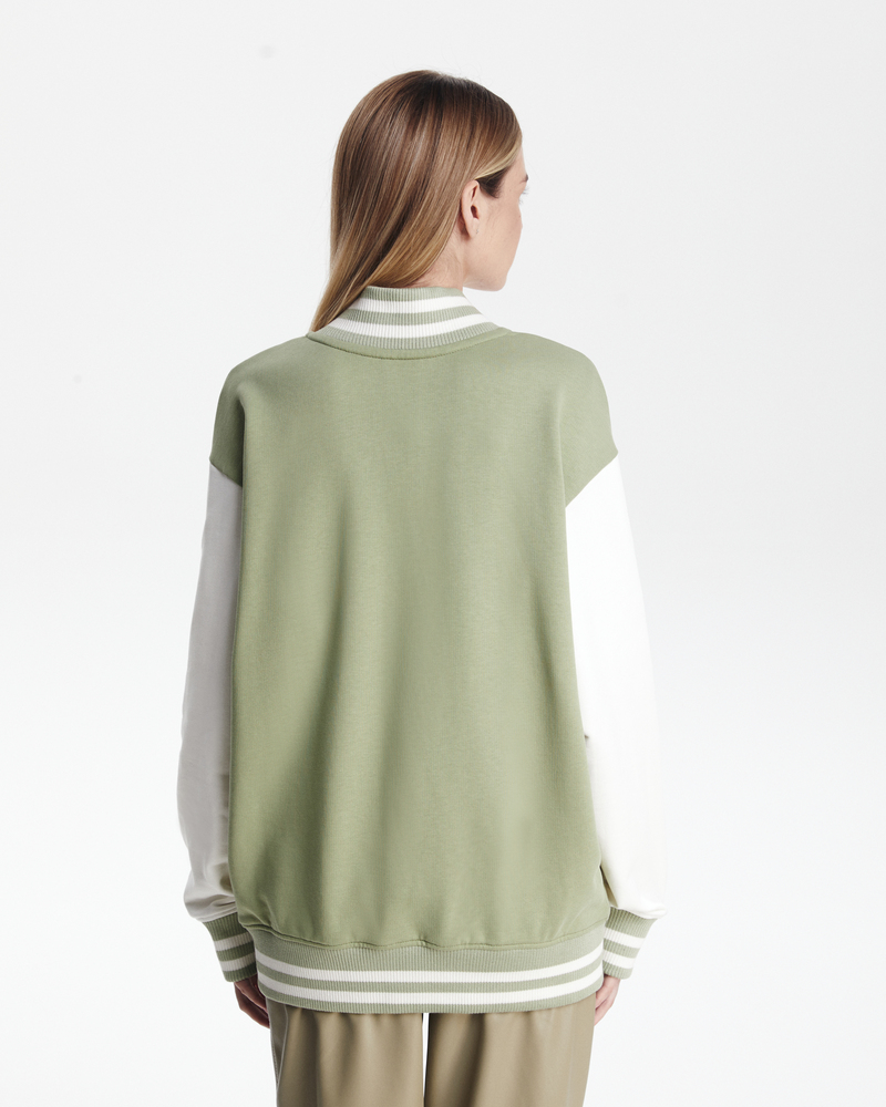 Бомбер классический - комбинированный. Воротник, манжеты и резинка - подвяз с контрастными полосками. Клепки, полоски, вставки на карманах - в цвет рукавов. Два кармана снаружи.