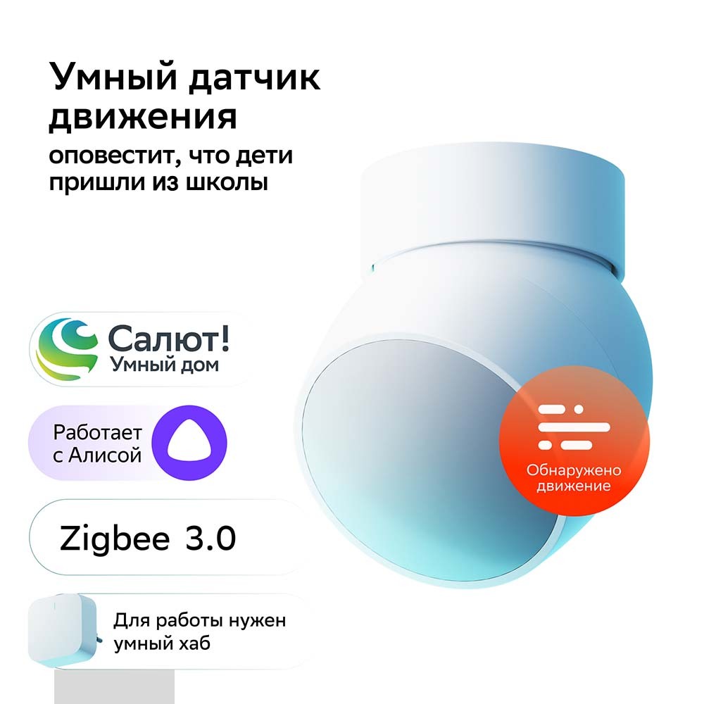 Умный датчик движения Sber реагирует на перемещения источников тепла и оповещает о них.