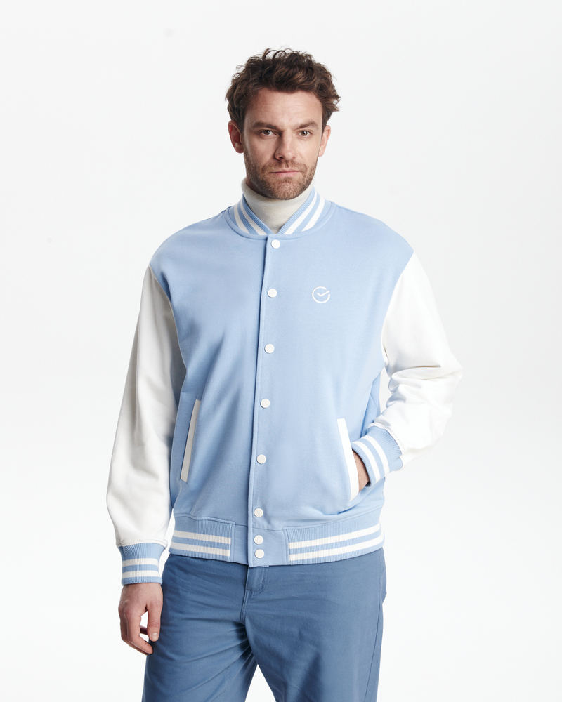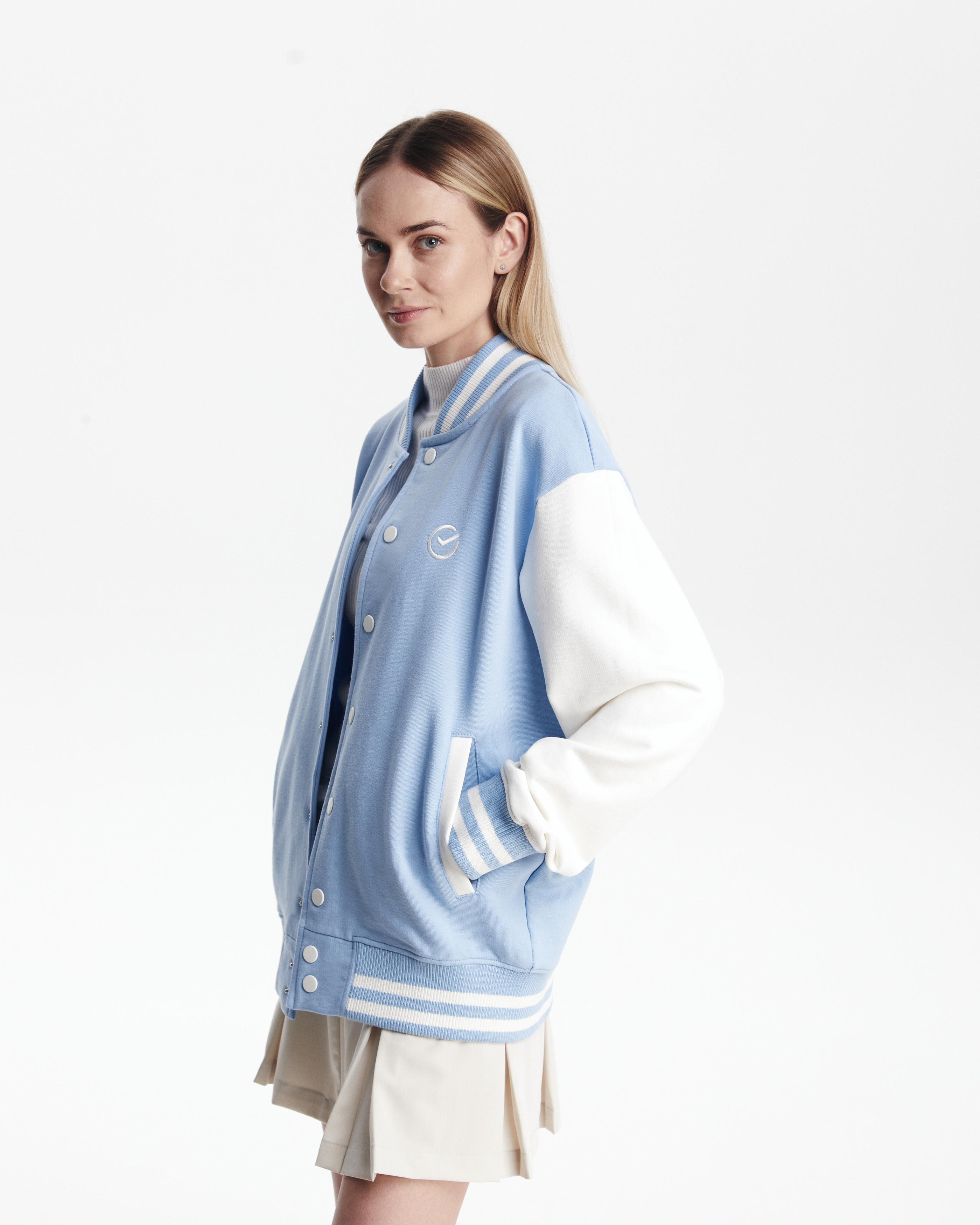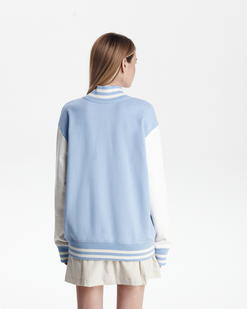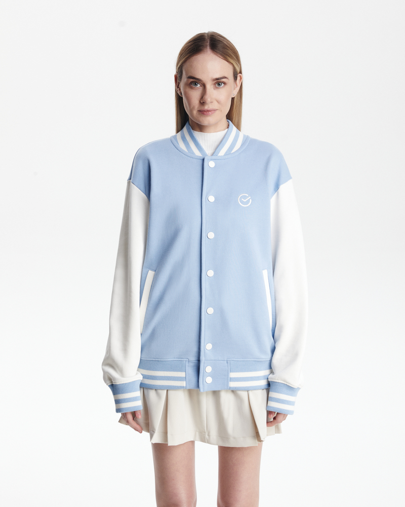 Бомбер классический - комбинированный. Воротник, манжеты и резинка - подвяз с контрастными полосками. Клепки, полоски, вставки на карманах - в цвет рукавов. Два кармана снаружи.
