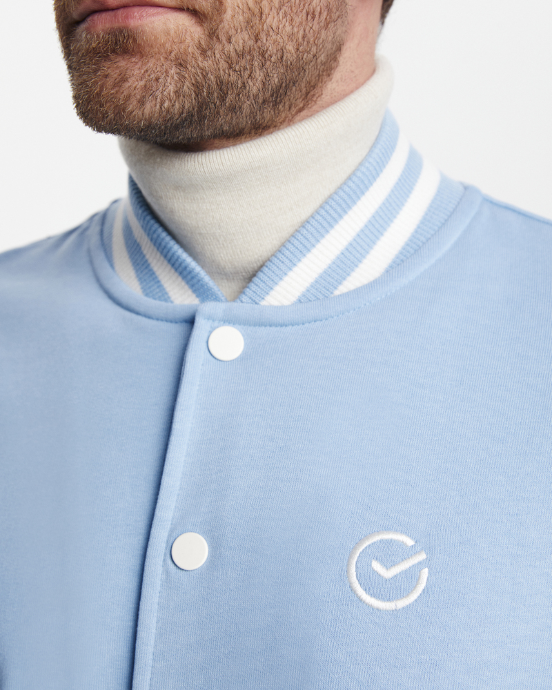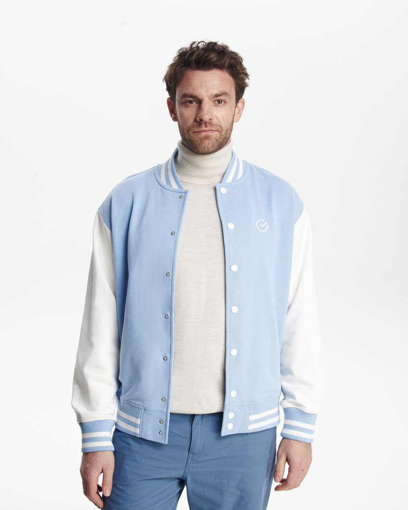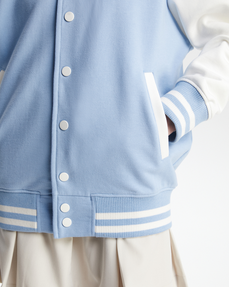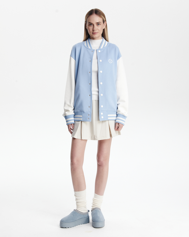 Бомбер классический - комбинированный. Воротник, манжеты и резинка - подвяз с контрастными полосками. Клепки, полоски, вставки на карманах - в цвет рукавов. Два кармана снаружи.